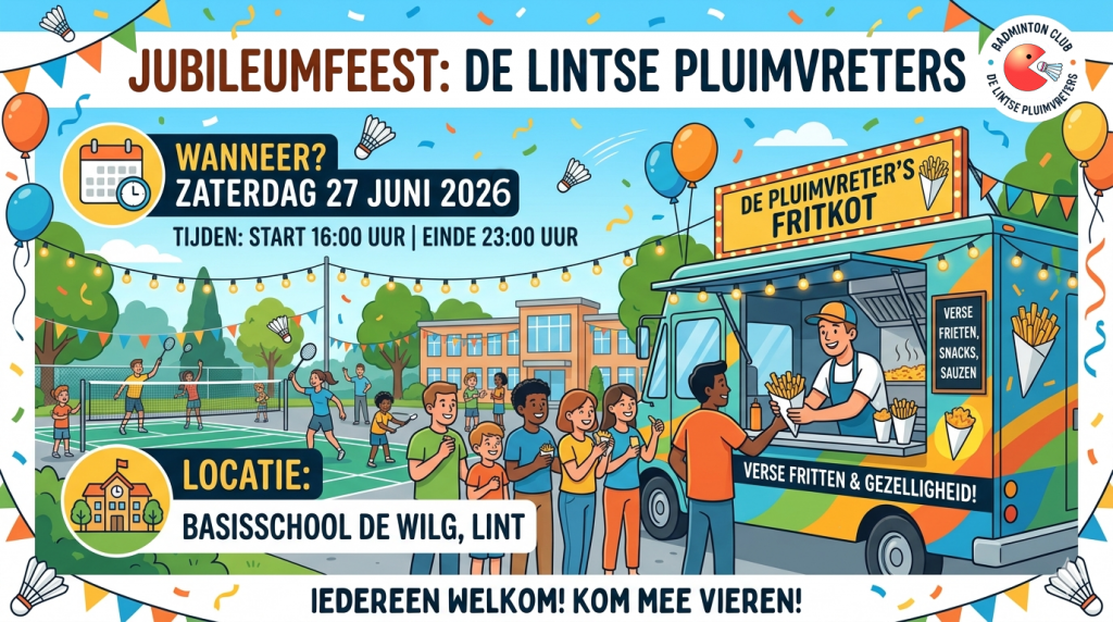Al een halve eeuw lang brengen we badmintonspelers van jong tot oud samen, met plezier, sportiviteit en vriendschap als vaste waarden. Dit gouden jubileum is niet enkel een terugblik op onze rijke geschiedenis, maar ook een blik vooruit naar vele mooie jaren vol spel en verbondenheid.